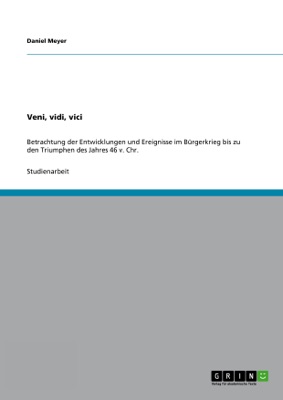 Diesen Ausspruch prägte Caesar, nachdem er bei Zela erfolgreich gegen den pontischen Herrscher Pharnakes II. zu Felde gezogen war. Die Quellen berichten, dass diese Schlacht nur wenige Stunden gedauert und auf römischer Seite kaum Opfer gefordert haben soll. In Anknüpfung an das Referat ,,Entwicklungen und Ereignisse bis zu den Triumphen des Jahres 46 v. Chr. soll in den folgenden Ausführungen der Frage nachgegangen werden, ob der berühmte Ausspruch auf das gesamte militärische und politische Geschick Julius Caesars während des Bürgerkrieges projiziert werden kann. Wenn dem so wäre, könnte man zu der Annahme kommen, dass Rom unter seiner Führung stets problemlos seine Siege errungen hatte. Dann ließe sich der Bürgerkrieg in wenigen Worten zusammenfassen: Julius Caesar kam aus dem Gallischen Krieg zurück, obsiegte über seine politischen und militärischen Widersacher, die ihm seine wohlverdienten Ehrungen verweigerten und erhielt schlussendlich uneingeschränkte Machtbefugnisse. Doch wäre diese Darstellung richtig War es nicht vielmehr so, dass Caesar während des Bürgerkrieges auch Niederlagen hinnehmen musste Niederlagen, die er teilweise selbst verschuldet und nur überstanden hatte, weil mehrere günstige Faktoren auf seiner Seite waren In beiden Deutungen der Worte ,,Veni, vidi, vici" steckt etwas Wahres. Es soll nachfolgend dargestellt werden, dass Caesar sowohl ein fähiger Stratege als auch ein risikofreudiger Glücksspieler war. Bevor jedoch in den Inhalt des zugrundeliegenden Referats eingestiegen werden kann, muss der kontextuelle Rahmen der Ausführungen erweitert werden. Aus diesem Grund müssen einleitend der Beginn und der Verlauf des Bürgerkrieges bis zum Jahre 48 grob dargestellt werden. Erst auf Basis dessen kann Caesars weiteres Vorgehen bis zu den Triumphen des Jahres 46 verstanden werden. Studienarbeit aus dem Jahr 2009 im Fachbereich Geschichte - Frühgeschichte, Antike, Note: 1,3, Friedrich-Schiller-Universität Jena (Institut für Altertumswissenschaften), Veranstaltung: Caesar."Review: